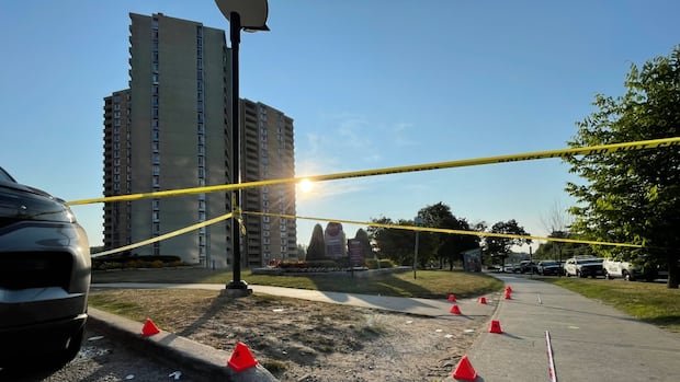 The officers responded to shooting reports near Martha Eaton Way and Trethewey Drive around 12:30 am, Toronto police said in an X position.