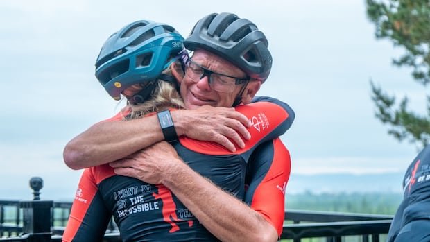 When the cyclists stopped in front of Terry Fox’s National Historic Monument in Thunder Bay, Ontario, the sound of the cheers decreased in a moment of silence.